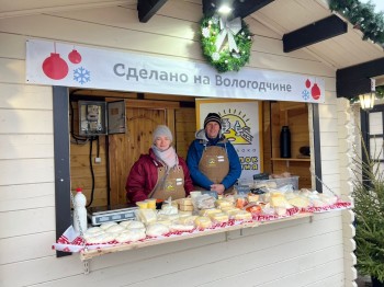 Гости выстроились в ряды, чтобы приобрести: вологодскую форель, ремесленные сыры, молочную продукцию, мясные деликатесы, тушёнку и сладости. Покупают, в том числе, и продукты на новогодний стол.