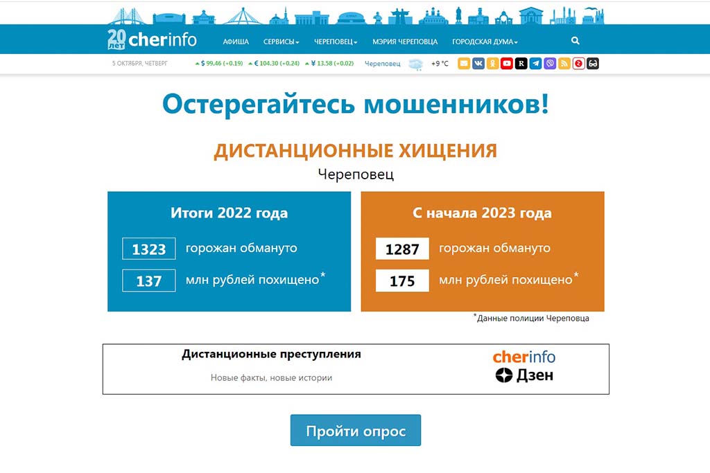 На официальном сайте Череповца ежедневно публикуется число людей, которых обманули мошенники, и сумма украденных денег. Еще можно сравнить данные с прошлым годом, посмотреть видеоролики, пройти тест.