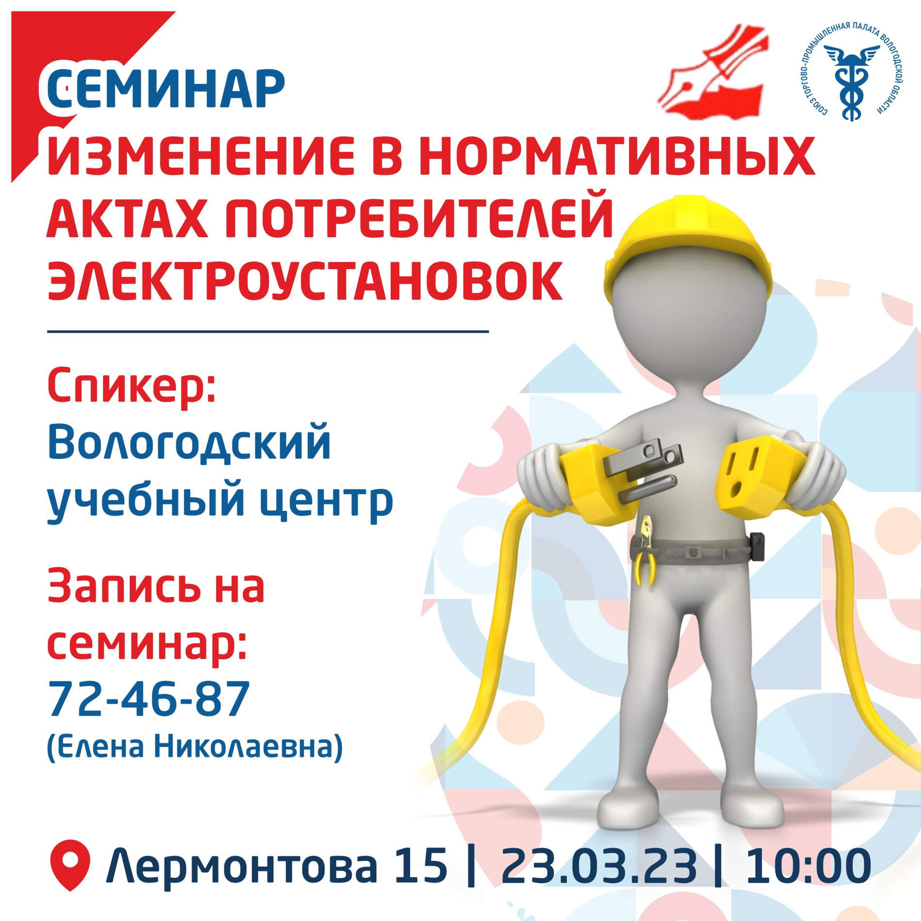 Союз Вологодская торгово-промышленная палата приглашает вас принять участие в семинаре по разъяснению новых требований по теме: "Изменения нормативных актов при эксплуатации электроустановок потребителей в 2023 году».