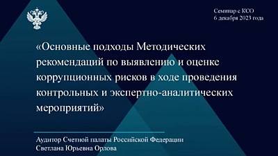 Семинар на тему «Основные положения Методических рекомендаций по выявлению и оценке коррупционных рисков в ходе проведения контрольных и экспертно-аналитических мероприятий» состоялся 6 декабря 2023 года при технической поддержке Портала Счетной палаты Российской Федерации и контрольно-счетных органов Российской Федерации под руководством аудитора Счетной палаты Российской Федерации Светланы Орловой.