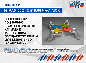 Вебинар Союза муниципальных контрольно-счетных органов «Особенности социально-психологического климата в коллективах государственных и муниципальных организаций» состоялся 16 мая 2024 года в режиме видеоконференцсвязи.