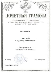 Владимир Леонидович Гертней, генеральный директор компании ООО "ЖИЛСТРОЙЗАКАЗЧИК", награждён Почётной грамотой министерства строительства и жилищно-коммунального хозяйства Российской Федерации за заслуги в труде и продолжительную работу!