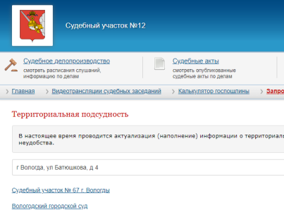 « В этом году на сайтах судебных участков раздел «Территориальная подсудность» обновился. Теперь там можно использовать систему поиска , – пояснил начальник Департамента по обеспечению деятельности мировых судей области Александр Коротких. – Достаточно ввести интересующий адрес на любом из сайтов судебных участков региона ».
