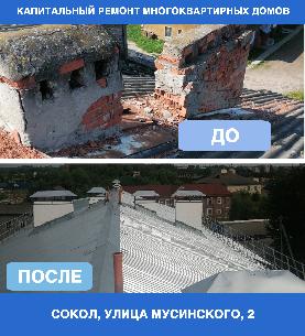 В Соколе в многоквартирных домах на Мусинского, 2 и Домостроителей, 11 завершились работы по капитальному ремонту крыши.