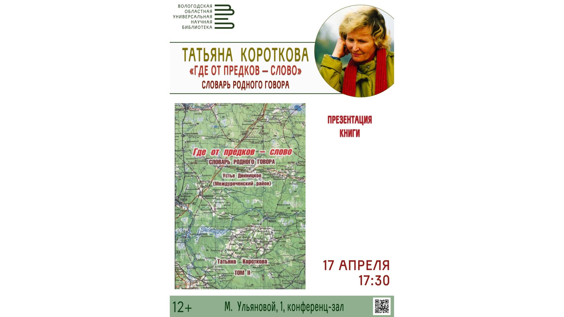 На встрече с читателями Татьяна Георгиевна расскажет о том, как шла работа над этой уникальной книгой, представит тех, кто поддержал ее при создании книги – это председатель регионального отделения Русского географического общества Надежда Максутова, ученые-лингвисты, преподаватели Вологодского государственного университета Гурий Судаков и Людмила Зорина, а также сыновья, коллеги и сотрудники библиотеки.
