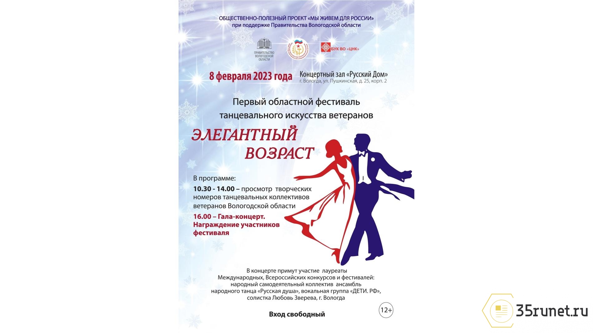 Первый областной фестиваль танцевального искусства ветеранов «Элегантный возраст» пройдет в рамках общественно полезного проекта «Мы живём для России». Его организаторами выступили Вологодское региональное отделение Всероссийской общественной организации ветеранов (пенсионеров) войны, труда, Вооруженных сил и правоохранительных органов и Центр народной культуры.