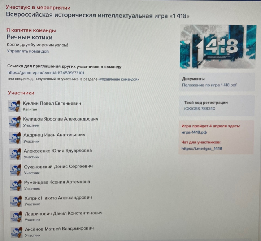 Игра проводилась в рамках подготовки к Международной акции «Диктант Победы». Вопросы игры были связаны с темами Диктанта Победы и посвящены основным событиям Второй Мировой войны и Великой Отечественной войны. Игра проходила в онлайн-формате. Команда состояла из 9 человек: Андриец Иван, Хитрик Никита – 11-СВ группа; Кулишов Ярослав, Алексеенко Юлия – 12-СВ группа; Аксёнов Матвей, Лавринович Данил – 13-СВ группа; Сухановский Денис, Куклин Павел, Румянцева Ксения – 14-СВ группа. Капитаном команды был избран Куклин Павел. Ребята показали достойные знания по истории и ответили верно на большинство вопросов. Благодарим участников и организаторов, ведь сохранение исторической правды наше общее дело.