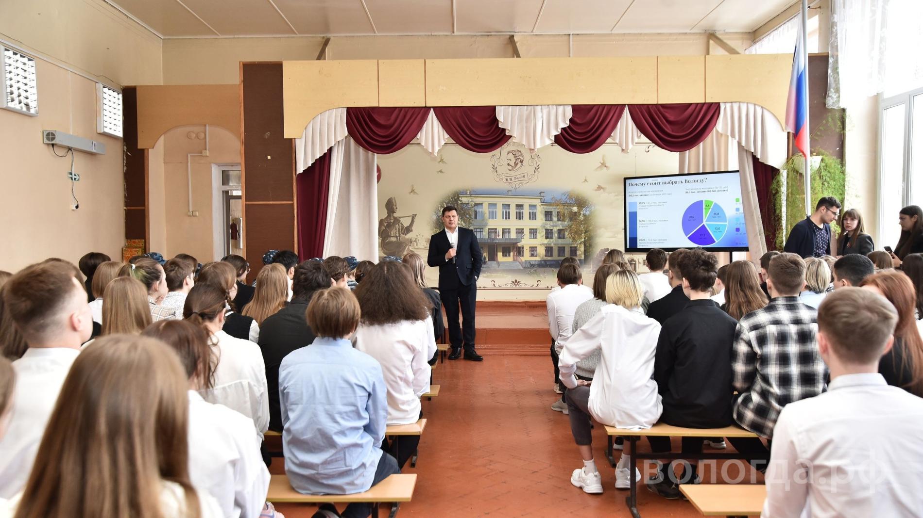 Диалог с Сергеем Воропановым школьники начали с личных вопросов о карьере Мэра, ребят интересовало то, как Сергей Воропанов добился такой высокой должности, и что для этого нужно. Ребят также интересовали любимые и не любимые предметы Мэра Вологды в школе, его занятия во внеурочное время.