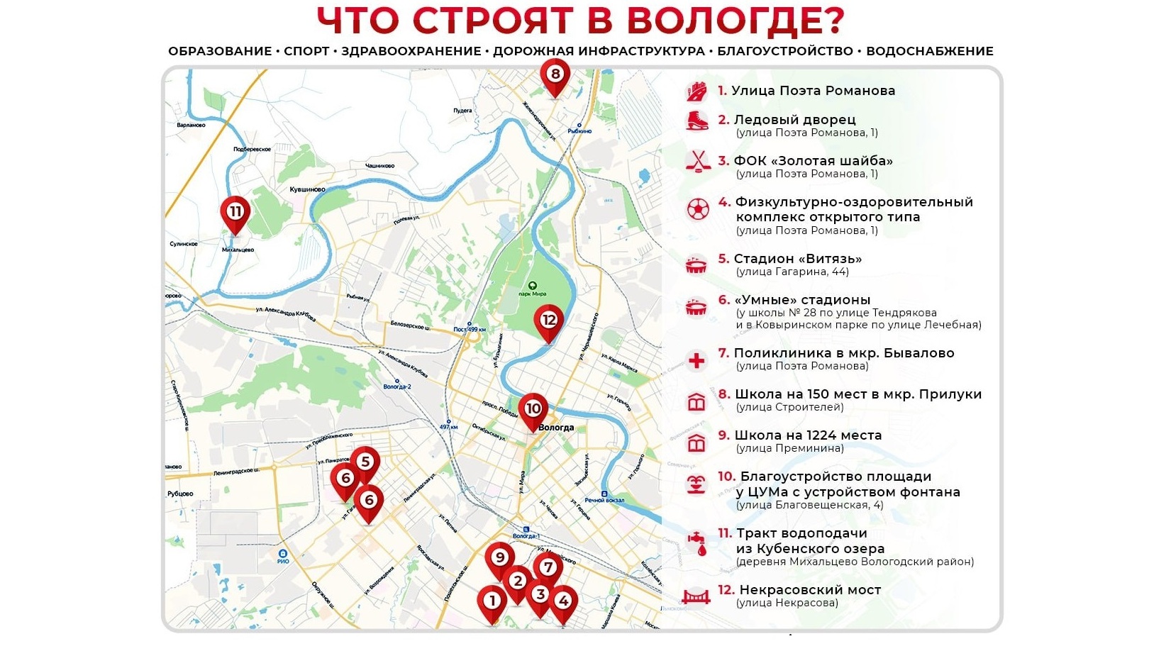 На карте размещено 13 объектов: ул. Поэта Романова, Ледовый дворец, ФОК «Золотая шайба», ФОКОТ на ул. Поэта Романова, ст. «Витязь», «умные» стадиона у школы № 28 и в Ковыринском парке, поликлиника в Бывалово, школа на 150 мест в Прилуках, школа на 1200 мест на ул. Преминина, площадь у ЦУМа, тракт водоподачи из Кубенского озера, Некрасовский мост.
