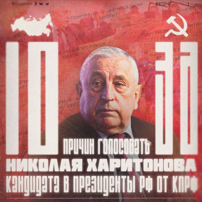 Лидер КПРФ и народно-патриотических сил России Г.А. Зюганов в своем telegram-канале назвал 10 причин поддержать Н.М. Харитонова – кандидата в президенты РФ от КПРФ:
