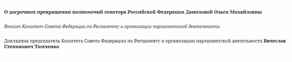 Совет Федерации досрочно прекратил полномочия сенатора Ольги Даниловой. Вопрос был рассмотрен в Совфеде сегодня.