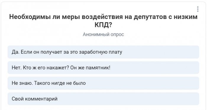 Подобная инициатива вызвала в соцсетях оживленную дискуссию. Председатель регионального парламента Сергей Жестянников опубликовал на своей странице «ВКонтакте» опрос. Спикер поинтересовался у подписчиков, нужно ли наказывать депутатов с низким КПД. Абсолютное большинство высказалось за то, чтобы воздействовать на недобросовестных народных избранников, получающих заработную плату.