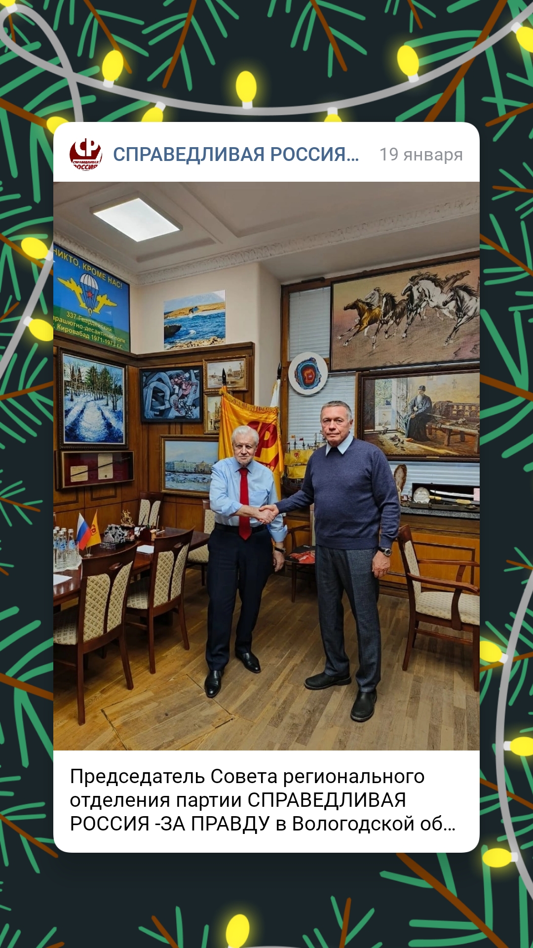 Председатель Совета регионального отделения партии СПРАВЕДЛИВАЯ РОССИЯ -ЗА ПРАВДУ в Вологодской области Виктор Леухин встретился с Лидером партии СПРАВЕДЛИВАЯ РОССИЯ-ЗА ПРАВДУ Сергеем Михайловичем Мироновым. Обсудили вопросы, связанные с предстоящими выборами Губернатора области и кандидатов в депутаты Вологодской городской Думы, которые пройдут в сентябре 2024 года. Также речь шла о сборе подписей в поддержку выдвижения Владимира Путина на пост Президента.
