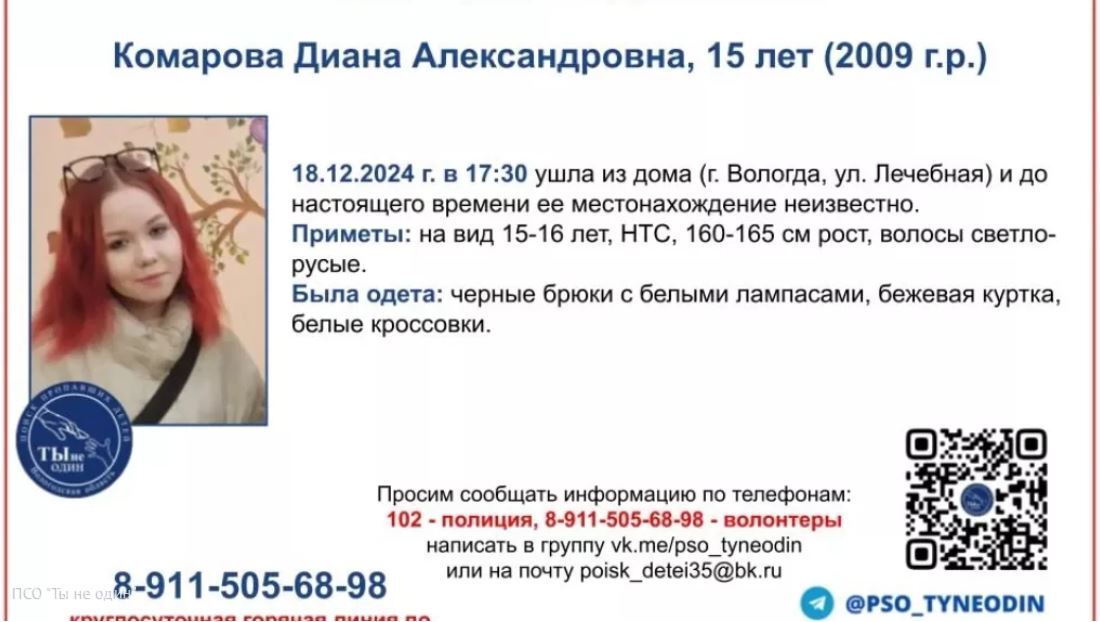 Фото: ПСО "Ты не один" В Вологде продолжаются поиски 15-летней школьницы Дианы Комаровой, которая пропала 18 декабря и до сих пор не вернулась домой.