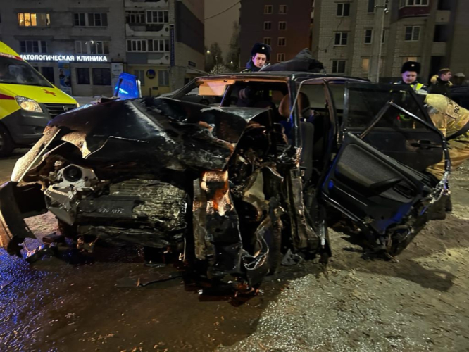 От удара отечественная легковушка превратилась в искореженную груду металла.