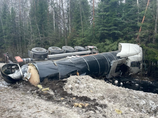 Тонны битума разлились из разбившейся автоцистерны в Череповецком районе