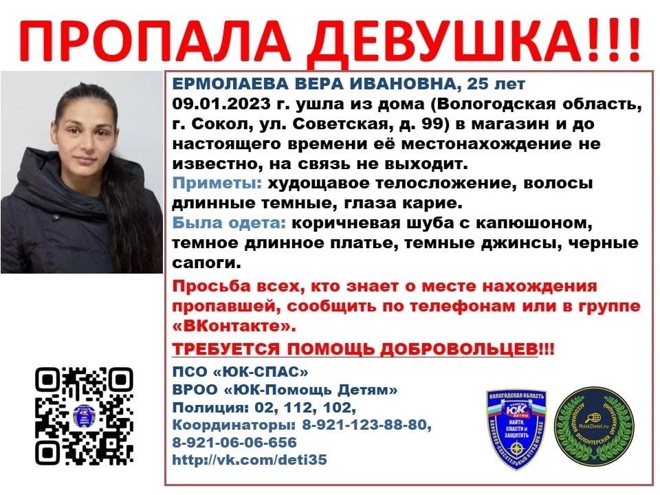 В Соколе разыскивают 25-летнюю Веру Николаевну Ермолаеву, которая ушла из дома в магазин 9 января и до сих пор о ее местонахождении ничего не известно.