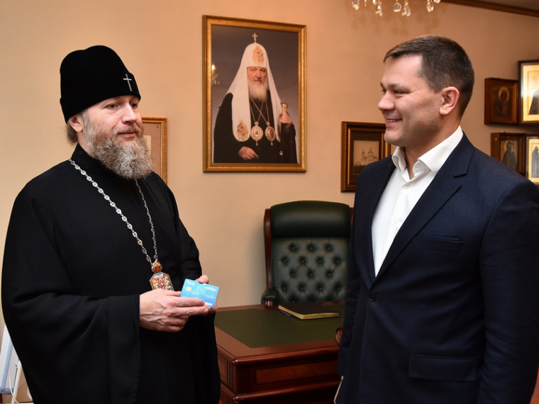 «Уважаемый Владыка, я с коллегами хочу вручить вам, как истинному патриоту нашего края, «Карту жителя Вологды». В частности, карта позволяет со скидкой приобретать билет в общественном транспорте, получать бонусы от партнеров. А за участие в различных акциях, особенно экологических, можно получить бонусные баллы и обменять их на бесплатное посещение бассейна, театра, кино. Рад вручить вам «Карту жителя Вологды», зная ваше трепетное отношение к городу Вологде. Подчеркну, что сейчас уже 17 тысяч человек стали держателями «Карты жителя Вологды», а ее партнерами – 127 компаний», – сказал Мэр Вологды Сергей Воропанов, вручая брендированную карту Владыке.