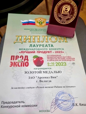 На международной выставке «ПРОДЭКСПО-2023» ЗАО «Арсенал Вин» получил очередную награду за качество продукции. С 6 февраля проходила международная выставка «ПРОДЭКСПО – 2023», на которой была представлена продукция 34-х предприятий Вологодской области. Помимо выставки, организаторы проводили конкурс на звание Лучшего продукта этого года. От нашей области заявки на участие подали 13 предприятий. Оценив образцы продукции, жюри члены жюри отдали предпочтение ЗАО «Арсенал Вин». Золотая медаль присуждена настойке сладкой «Резной палисад Рябина на коньяке» и серебряная медаль – водке «Вологодская марка Лесные ягоды Клюква». От всей души поздравляем наших производителей!