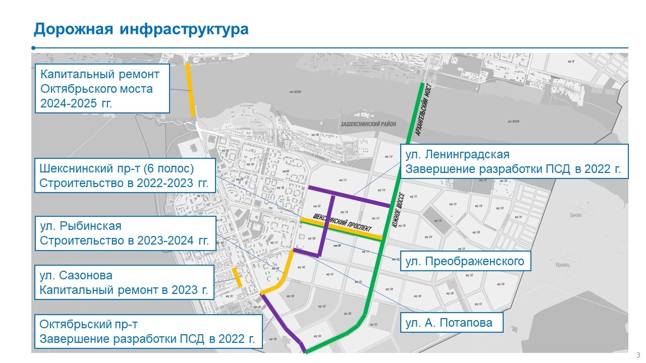 «Итак, в 2023 году завершится строительство Шекснинского проспекта. Он станет шестиполосным, с тротуарами и велодорожками. Капитальный ремонт ждет часть улицы Сазонова. Отремонтируем дорогу к новому детскому саду, который скоро здесь построят. Начнутся работы и по продолжению улицы Рыбинской, а через год приступим к ремонту Октябрьского моста. На эти цели из федерального бюджета выделено 1,8 миллиарда рублей», — отмечает мэр города.
