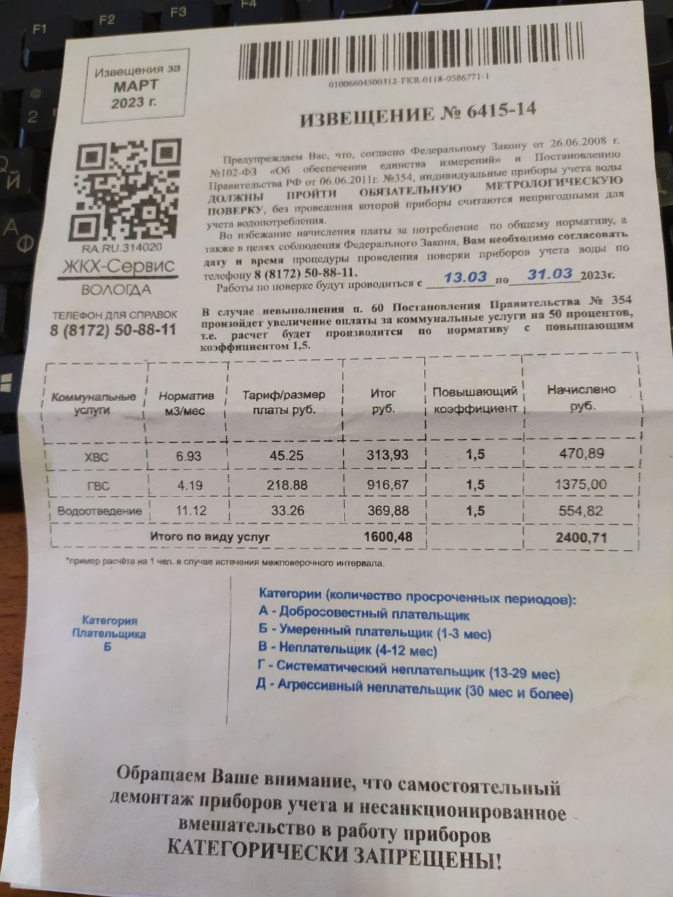 В лжеизвещении, как правило, фигурируют такие фразы, как «Предупреждаем Вас», «должны пройти обязательную метрологическую поверку». На листовке указываются законы и постановления Правительства, что придаёт солидности этому «документу». Кроме того, на листовке может стоять куар-код или штрих-код. Всё это очень легко может ввести в заблуждение потребителя услуг.
