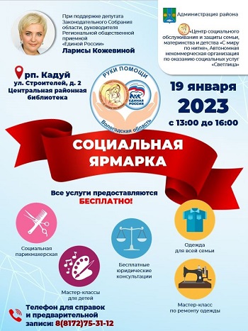 Кроме того, в районной библиотеке с 12 до 15 часов пройдет “Социальная ярмарка”. Желающие смогут выбрать одежду на взрослых и детей. Организаторы привезут на ярмарку игрушки и необходимые товары для самых маленьких. Будет работать и социальная парикмахерская. Все услуги – бесплатные.