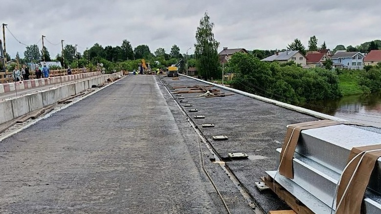 В посёлке Кувшиново продолжается ремонт моста через реку Вологду. Работы проходят в рамках нацпроекта «Безопасные качественные дороги». Готовность объекта составляет порядка 80%.