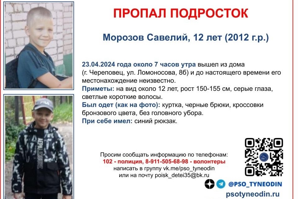 Информацию о местонахождении Савелия Морозова можно сообщить в полицию по номеру « 102 » или волонтерам по телефону +7 911 505−68−98 .