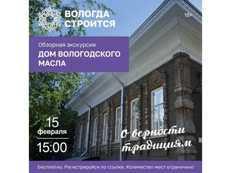 15 февраля в 15.00 вологжане смогут побывать в Доме Вологодского масла, который был открыт в 2023 году в старинном отреставрированном купеческом доме и рассказывает о традициях изготовления продукта, ставшего главным брендом Вологды. Зарегистрироваться на эту экскурсию можно по ссылке https://forms.yandex.ru/u/65cc9b933e9d082fcfa2d71b/ .