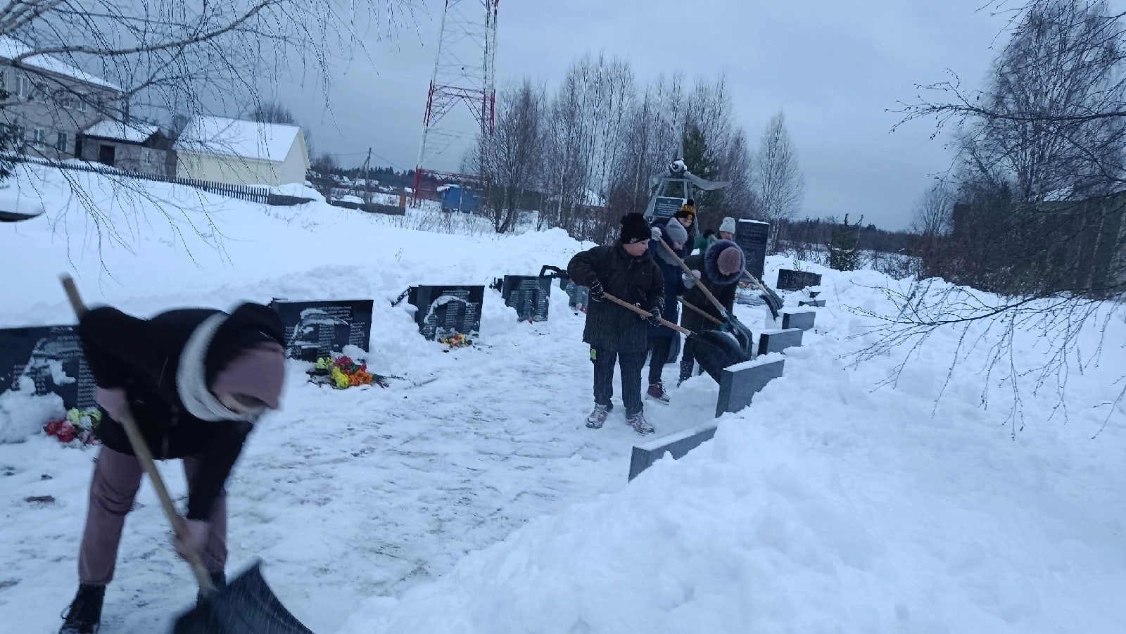 Юнармейцы Пяжелской школы убрали снег у памятника землякам-участникам войны