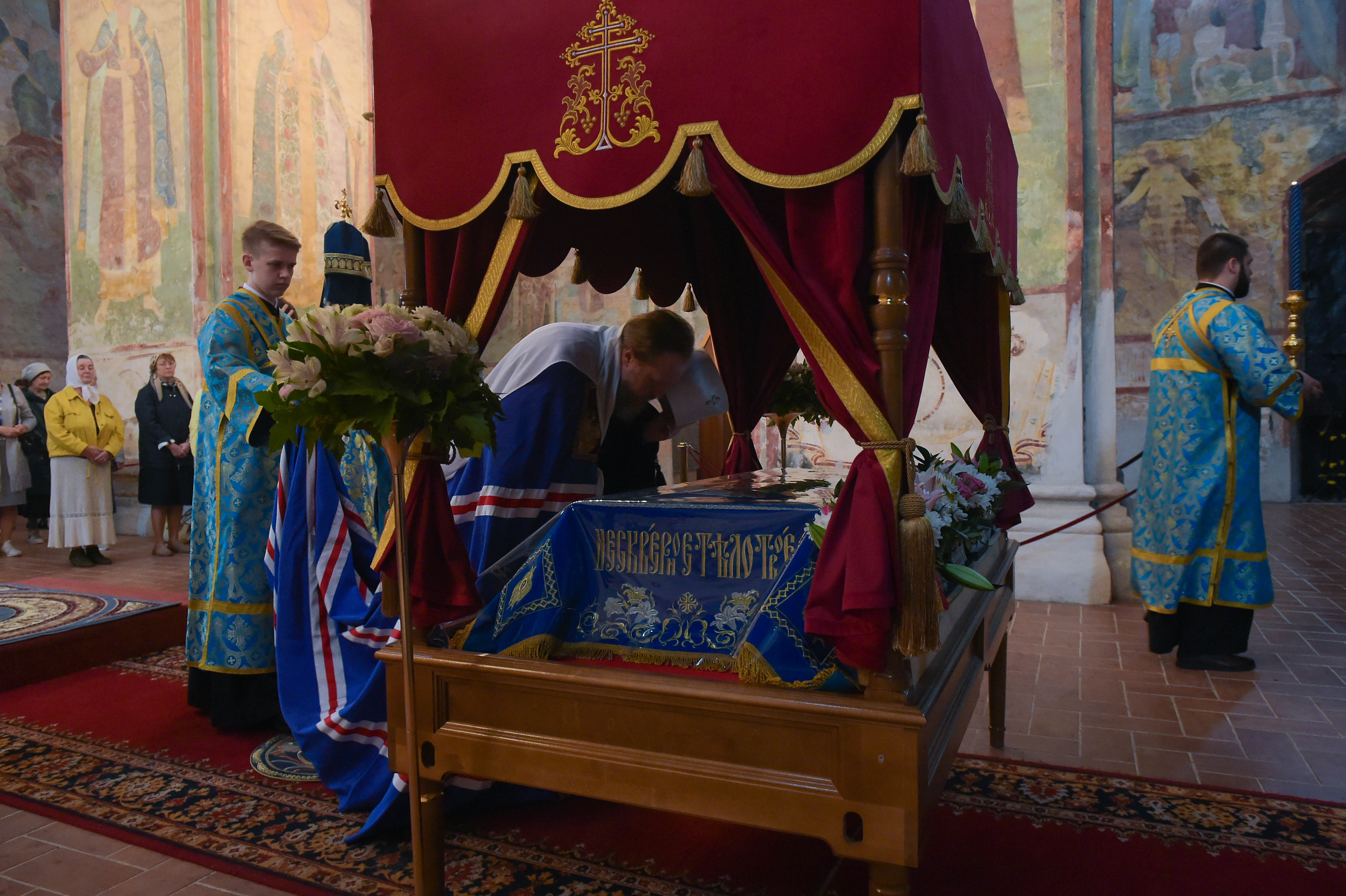 Верующие благоговейно приложились к плащанице, на которой изображена лежащая на одре Божия Матерь.