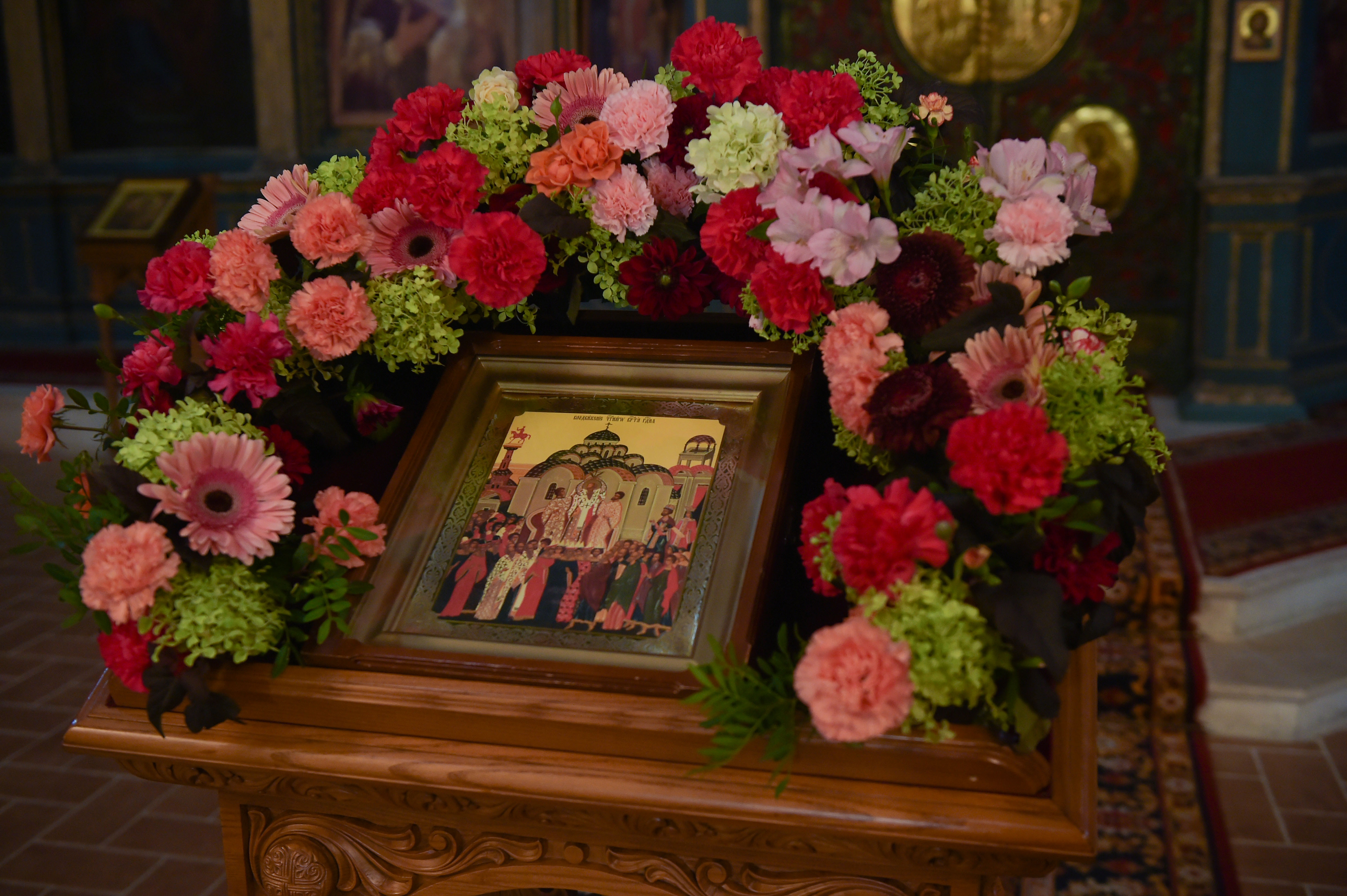Перед началом всенощного бдения украшенный цветами Крест был положен в алтаре на престоле.