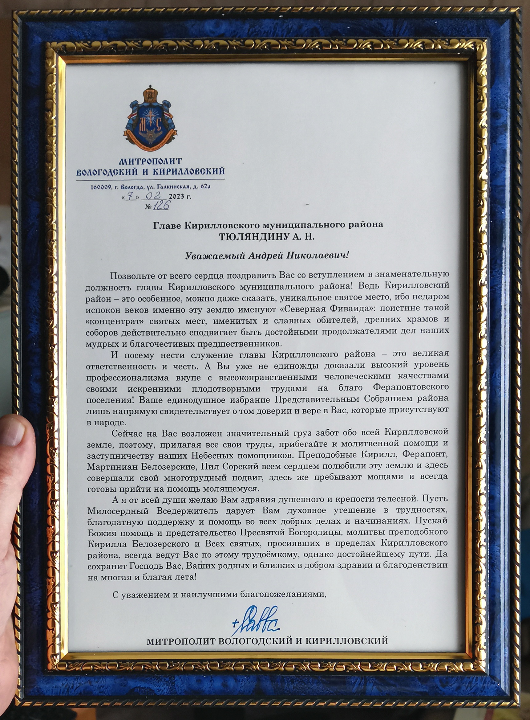 Благочинный Кирилловского церковного округа протоиерей Владимир Колосов вручил вновь избранному главе Кирилловского района Андрею Николаевичу Тюляндину поздравительный адрес митрополита Вологодского и Кирилловского Саввы