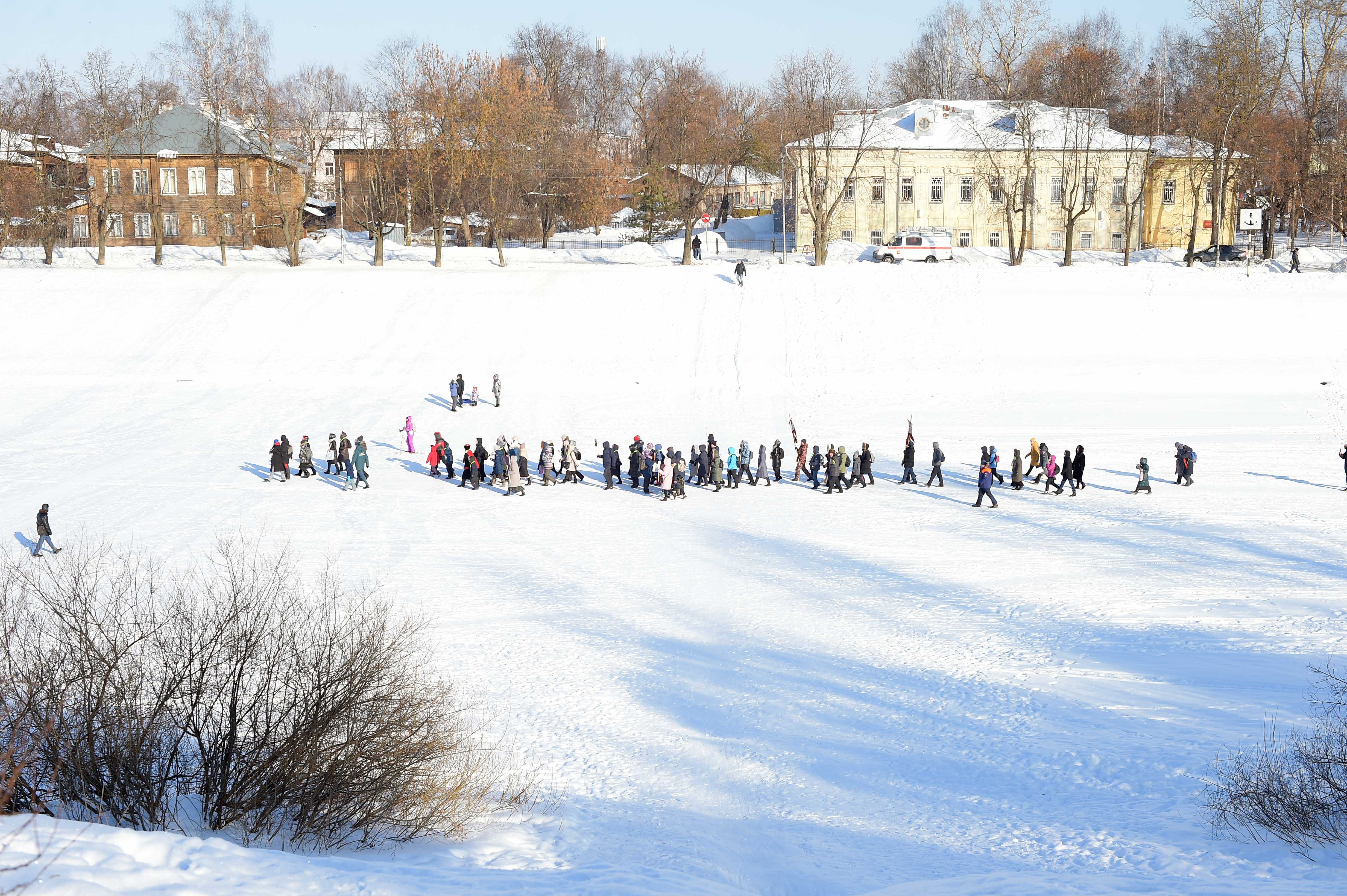 День стоял морозный и солнечный, погода придавала бодрости, и восьмикилометровый ледовый путь паломники прошли довольно быстро. По мере движения крестный ход заметно вырос: люди присоединялись к нему и у Никольского храма во Владычной слободе, и у Соборной горки, у Лазаревского храма и у парка Мира.