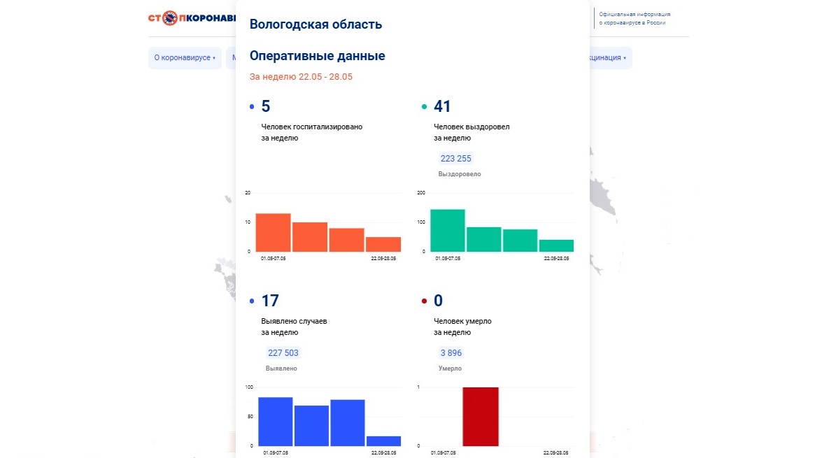 Данные об эпидситуации в Вологодской области опубликовали на сайте «Стопкоронавирус.рф», включая статистику заболевших в период с 22 по 28 мая.