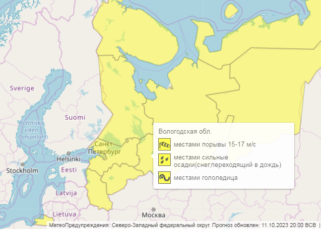 Ночь с 11 на 12 октября в Вологодской области обещает быть крайне «весёленькой» для всех ,кто путешествует по дорогам нашего региона или работает на воздухе в поздний час.