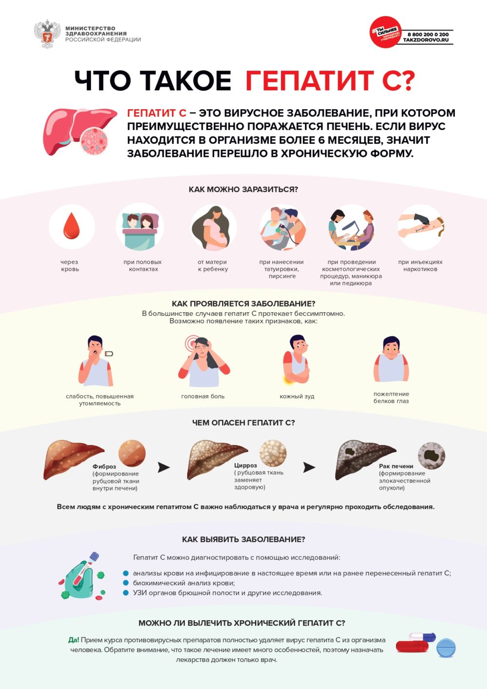 Гепатит С уже многие годы является излечимым заболеванием. Прием курса специальных противовирусных препаратов приводит к полному удалению (элиминации) вируса из организма человека и выздоровлению от гепатита С. Большинству’ пациентов в нестоящее время может быть назначен прием таблетированных препаратов в течение 2-3 месяцев. Но важно помнить, что лечение гепатита С имеет мною особенностей, поэтому назначать препараты должен только врач. Человек, который успешно вылечился от гепатита С. не может заразить других людей.