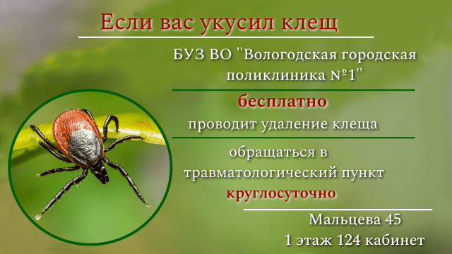 Напоминаем! Если вы обнаружили на своем теле клеща, вы можете обратиться в травмпункт на 1 этаже поликлиники в 124 кабинет, круглосуточно и извлечь насекомое абсолютно бесплатно.