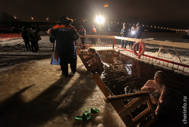 «Купели планируем сделать утром 18 января. Каждая будет три на три метра с ограждениями на льду и под водой. Будут работать теплые раздевалки на лыжной базе, поставим вешалки недалеко от прорубей. Будут дежурить скорая, полиция и спасатели. Массовые купания пройдут с 20 часов 18 января до 3 часов утра 19 января и 19 января с 8 до 19 часов. В том году желающих искупаться было немного: подвела погода. Бывало, в крещенских купаниях участвовали до пяти тысяч человек», — рассказал cherinfo начальник лыжной базы Алексей Овчинников.