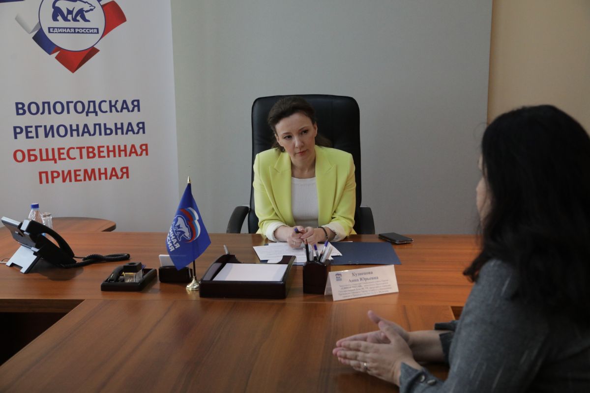 Личный прием граждан в региональной Общественной приемной «Единой России» в Вологде провела заместитель Секретаря Генерального совета Партии, заместитель Председателя Государственной Думы Федерального Собрания Российской Федерации, Председатель Комиссии Президиума Генерального совета Партии по работе с обращениями граждан к Председателю Партии Д.А.МЕДВЕДЕВУ, Председатель Комиссии Генерального совета Партии по защите материнства, детства и поддержки семьи Анна Кузнецова. За содействием в решении их вопросов обратились четыре человека.