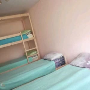 две односпальные кровати и одна двухярусная, постельные принадлежности, полотенца.
