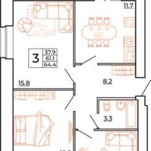 - Жилая площадь: 37.9 м²