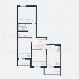 Кухня 16,0/ комнаты:16,2, 16,0 и 14,8 /ванная 3,8 / санузел 3,0/ прихожая 15,0/ лоджия: 5,7 и 4,1
