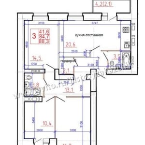 Отделка «под чистовую»: входная металлическая дверь, пол – цементная стяжка, стены отштукатурены, окна – 2-камерный стеклопакет, лоджия – 1-камерный стеклопакет, сантехника – заведены трубы в квартиру, установлены приборы учета, установлен прибор учета тепла.